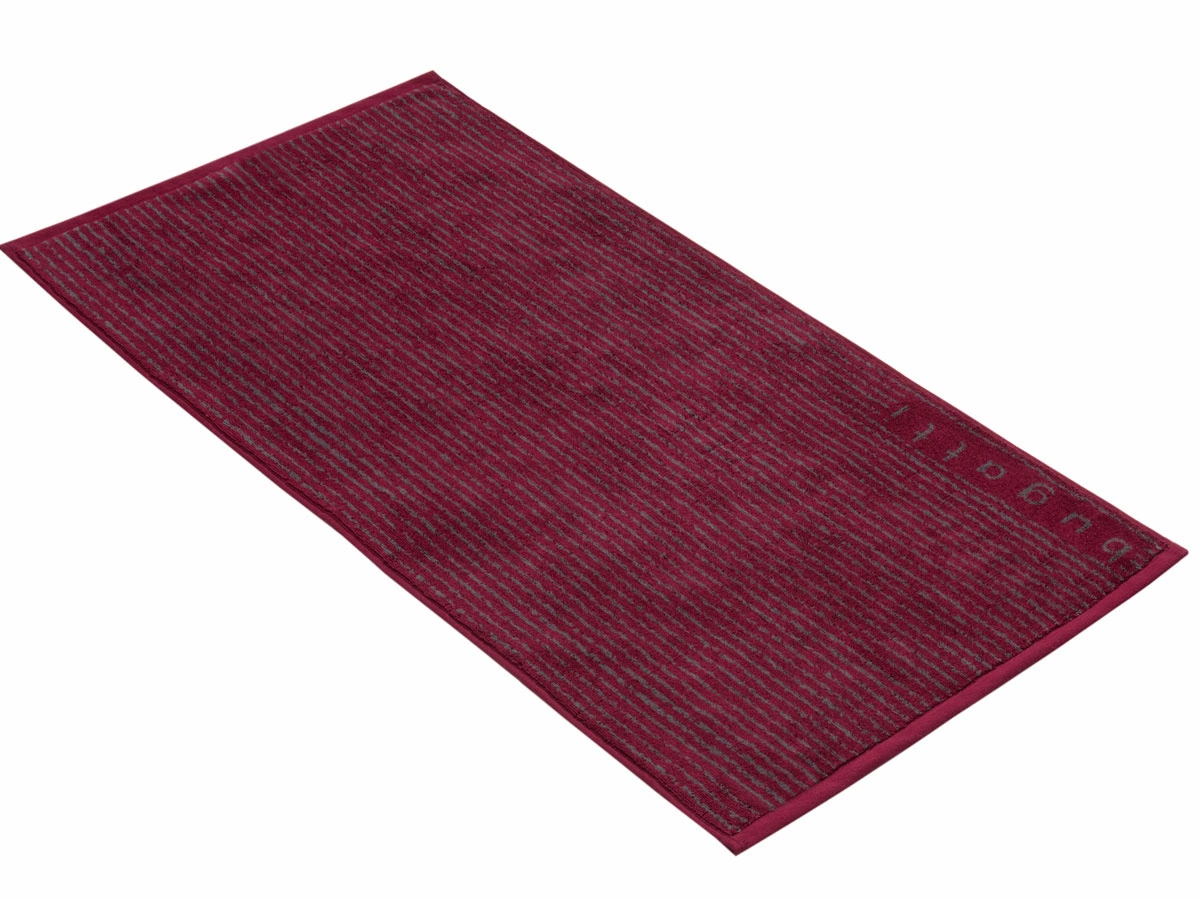 Żakardowy ręcznik Tiago niemieckiej marki bugatti. Delikatne szare paseczki na burgundowym tle. U dołu logo marki. Wykonane z wyjątkowo miękkiej bawełny soft cotton z ekologicznych upraw. Dostępne w trzech kolorach.