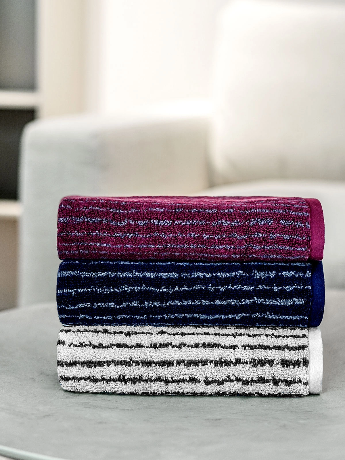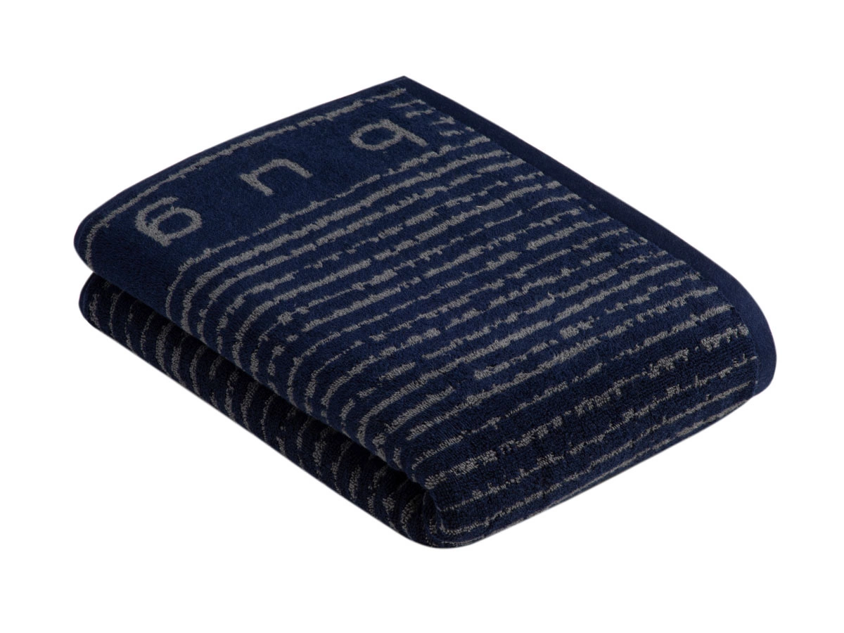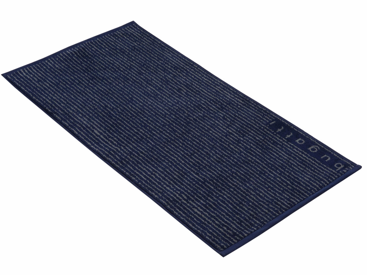 Żakardowy ręcznik Tiago Blue Marine niemieckiej marki bugatti. Delikatne szare paseczki na granatowym tle. U dołu logo marki. Wykonane z wyjątkowo miękkiej bawełny soft cotton z ekologicznych upraw. Dostępne w trzech kolorach.
