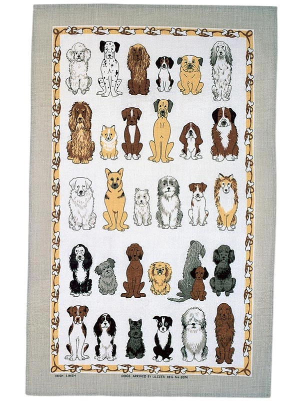 - Ściereczka kuchenna Dogs Arrived przedstawia różne rasy psów na białym tle z szarym wykończeniem. Wykonana w 100% z bawełny, świetnie nadaje się do wycierania naczyń.