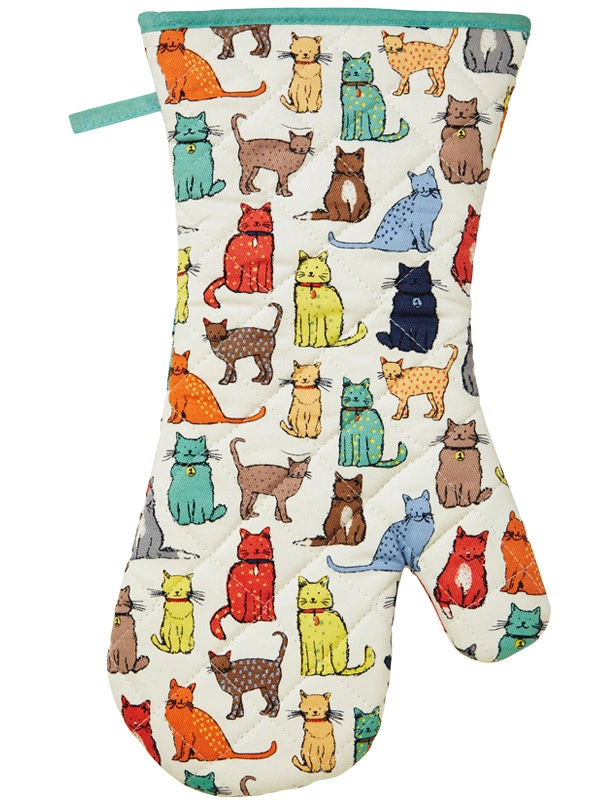 - Rękawica z kolekcji Catwalk prezentuje kolorowe postacie kotów na białym tle. Stanowi ochronę dla dłoni przed gorącymi talerzami i tacami w kuchni, ale jednocześnie sprawia, że wygląda się stylowo. Wykonana w 100% z bawełny z wypełnieniem poliestrowym .