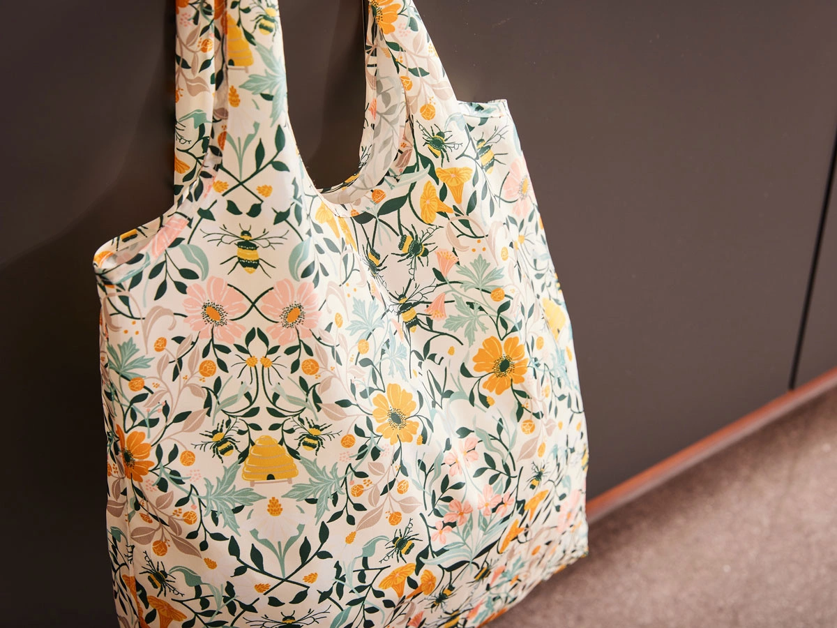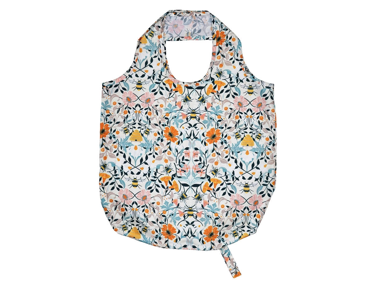 - Siatka na zakupy Bee Bloom we wzór inspirowany sztuką i rękodziełem. Miododajne kwiaty w kolorze pomarańczy zestawione z zielonymi listkami i pszczołami. Dzięki łatwemu zwinięciu i zapięciu na guziki, może być przechowywana w torebce lub kieszeni.