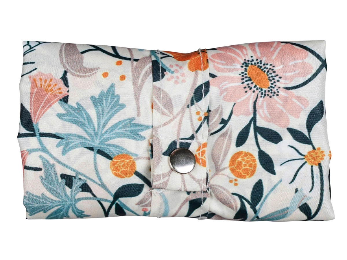 Siatka na zakupy Bee Bloom we wzór inspirowany sztuką i rękodziełem. Miododajne kwiaty w kolorze pomarańczy zestawione z zielonymi listkami i pszczołami. Dzięki łatwemu zwinięciu i zapięciu na guziki, może być przechowywana w torebce lub kieszeni.