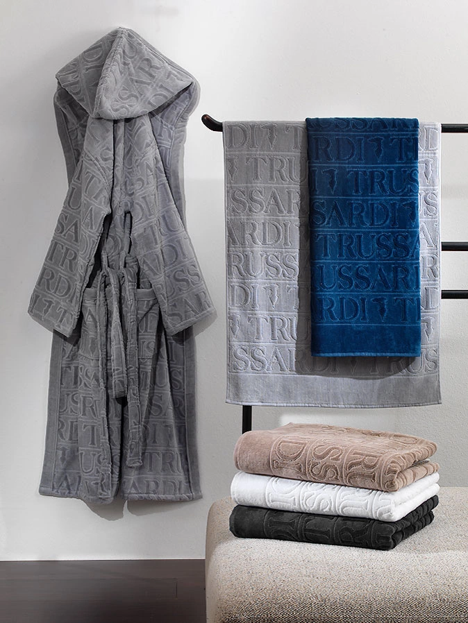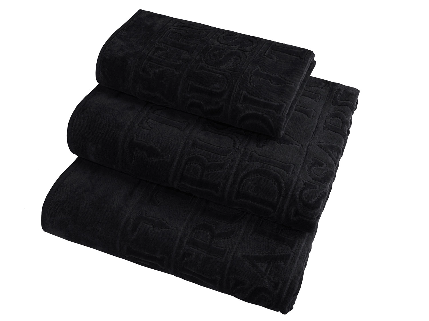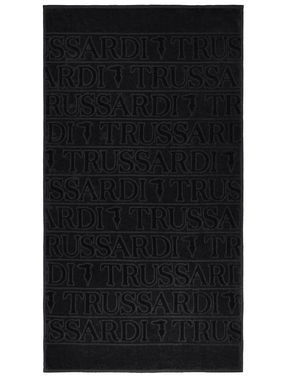 Ręcznik z kolekcji Overlogo 005 w kolorze czarnym marki Trussardi. Ciekawa kolorystyka, z jednej strony delikatny welur z wytłaczanym logo marki, z drugiej strony chłonne frotte. Wykonany w 100% z bawełny. Do każdego ręcznika dołączony został hologram świadczący o autentyczności produktu.