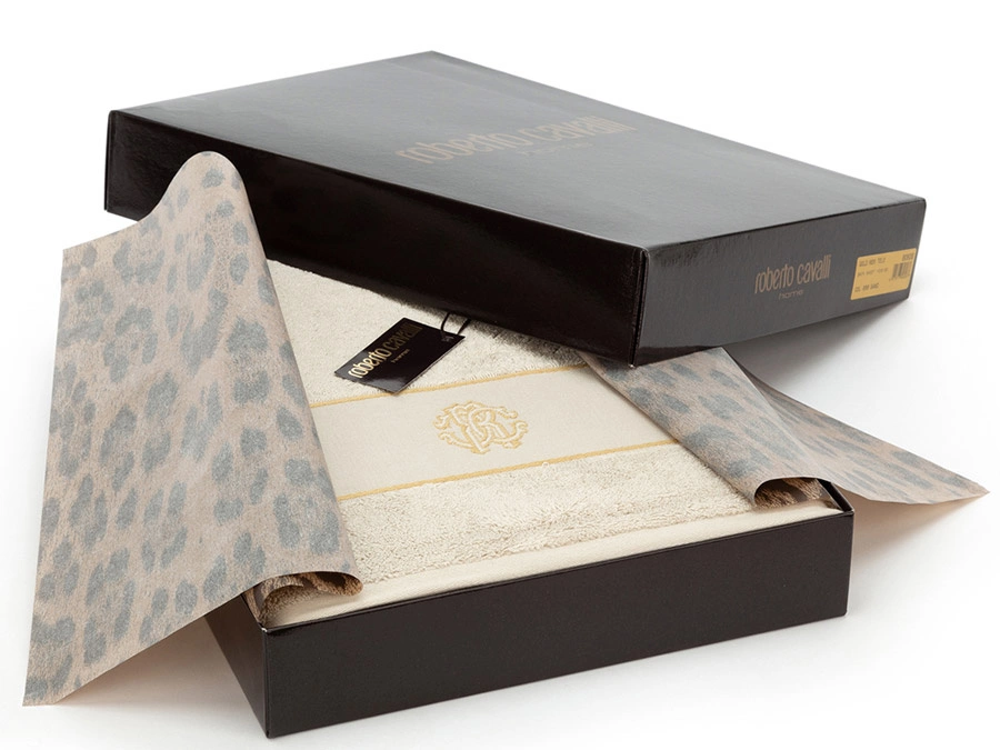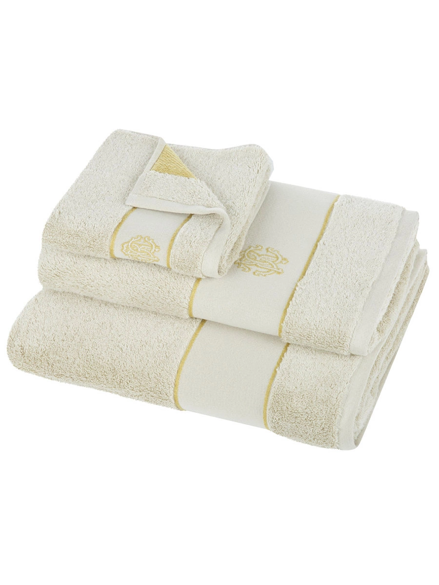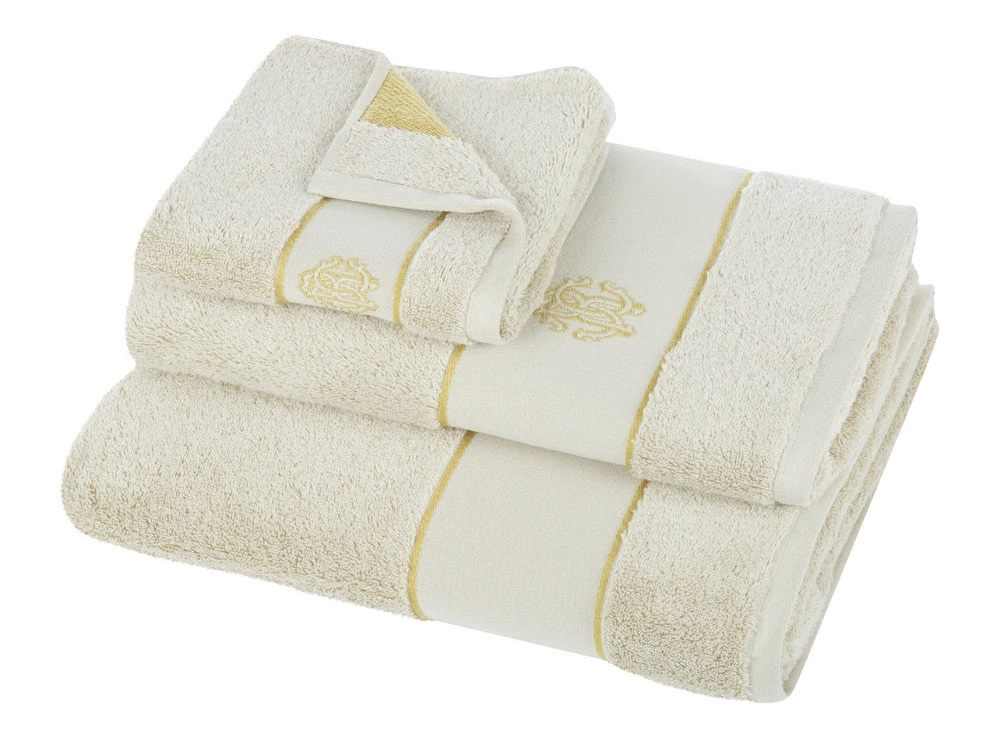 Elegancka kolekcja ręczników Gold New Sand od Roberto Cavalli. Delikatny, piaskowy kolor, u dołu ozdobna taśma z ornamentowym logo projektanta w kolorze złotym. Wykonany ze 100% bawełny. Ręczniki zapakowane w eleganckie pudełko z bibułką. Do każdego ręcznika dołączony został hologram świadczący o autentyczności produktu.