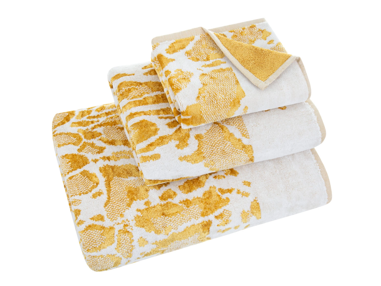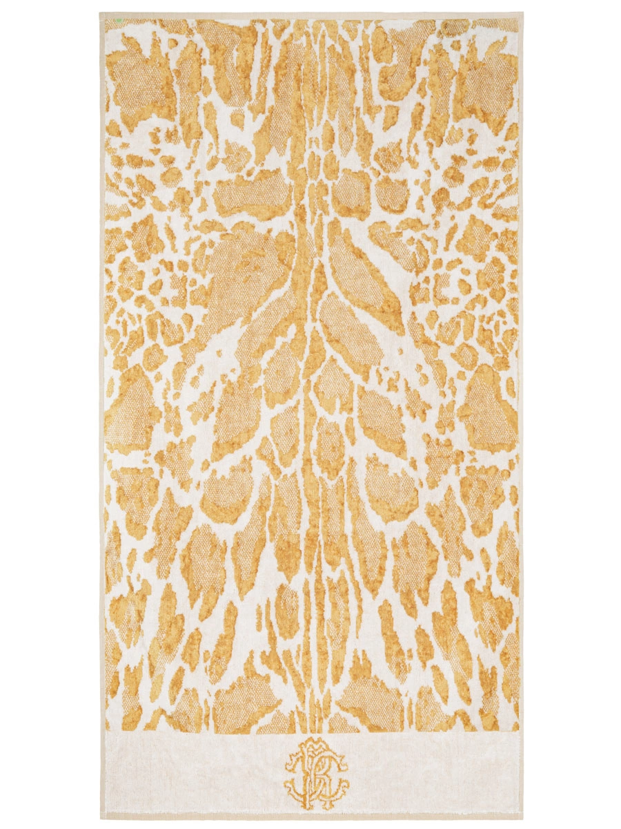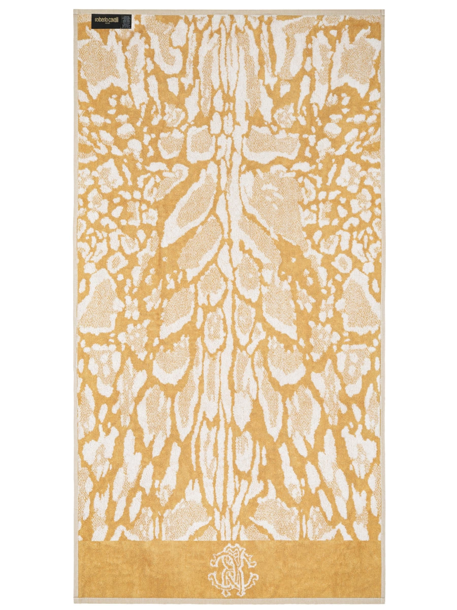 Odważna i elegancka kolekcja ręczników Linx Gold, włoskiego projektanta Roberto Cavalli. Piękny złoty, zwierzęcy wzór w na tle w kolorze złamanej bieli. U dołu monogram marki. Ręczniki z jednej strony aksamitne welurowe, druga strona to klasyczna pętelka frotte. Wykonane z mieszanki bawełny i wiskozy, bardzo chłonne i przyjemne w dotyku. Zapakowane w eleganckie pudełko z bibułką. Do każdego ręcznika dołączony został hologram świadczący o autentyczności produktu.