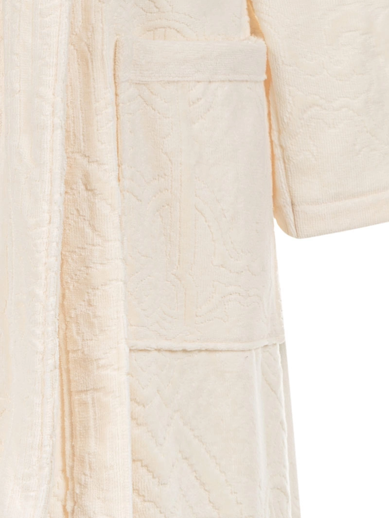 - Kremowy szlafrok z kolekcji Araldico włoskiego domu mody Roberto Cavalli. Model unisex. Klasyczny krój z szalem. Zewnętrzna strona wykonana z aksamitnego weluru z wytłaczanym monogramem, wewnętrzna to klasyczne, pętelkowe frotte. Dwie pojemne kieszenie,