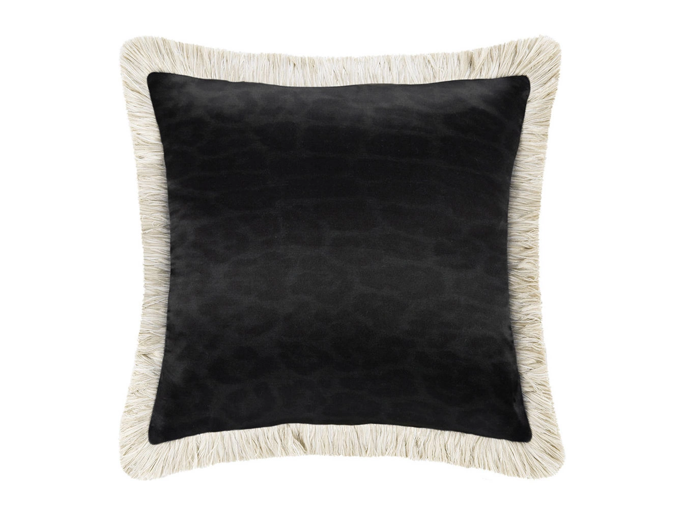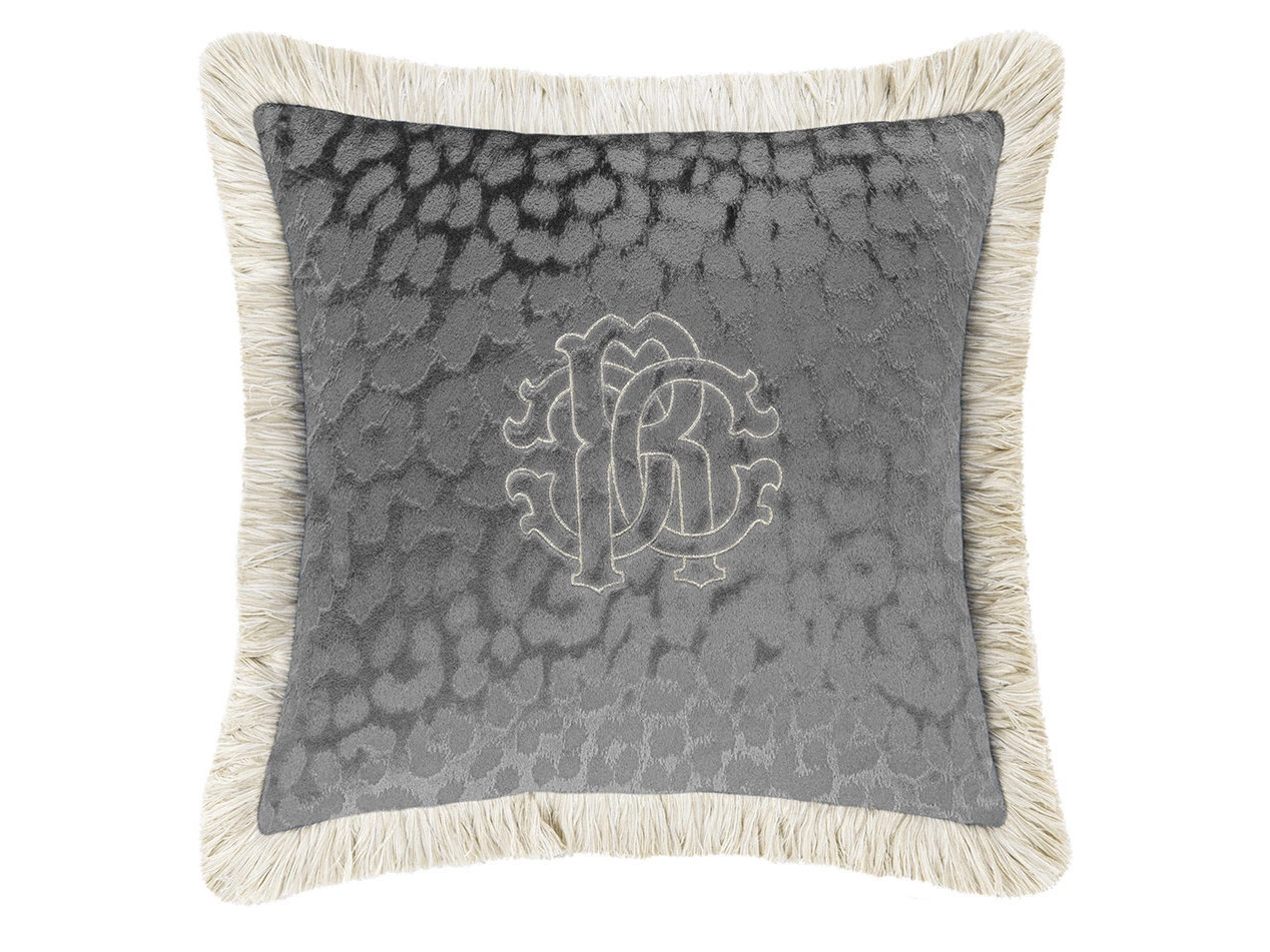 Poduszka dekoracyjna Monogram grey od włoskiego domu mody Roberto Cavalli. Welurowy przód w kolorze szarym z lamparcim wzorem wykończony eleganckim monogramem projektanta. Tył poduszki czarny, delikatny - jedwabny. Dookoła subtelne frędzle.