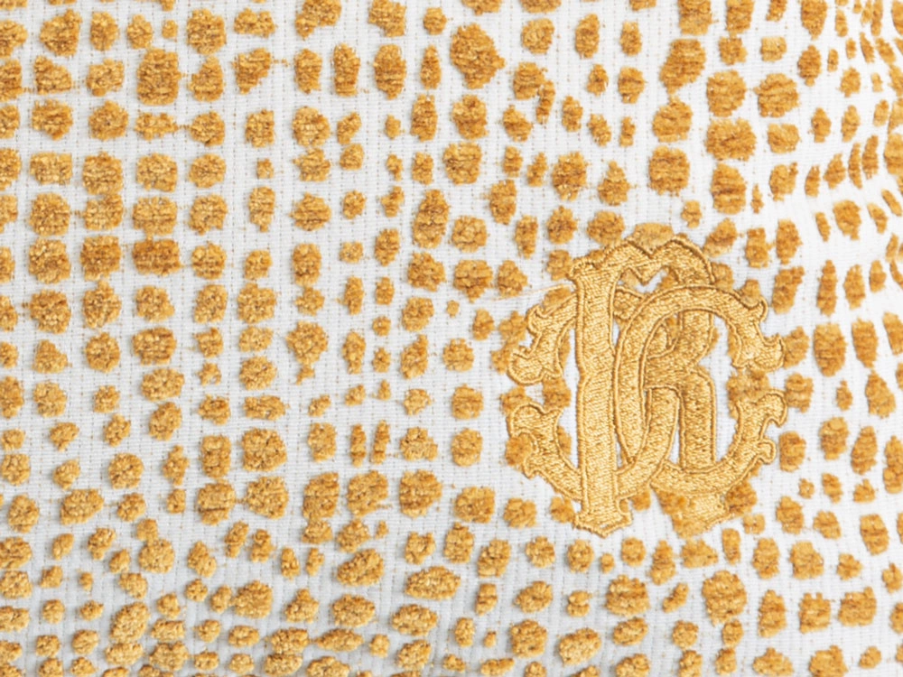 - Piękna poduszka dekoracyjna Skin Velvet Gold marki Roberto Cavalli. Białe tło z nakrapianymi, złotymi punkcikami. W rogu, elegancki, haftowany monogram marki. Wyszukana ozdoba salonu lub sypialni. Delikatne frędzle dookoła. Wkład syntetyczny.