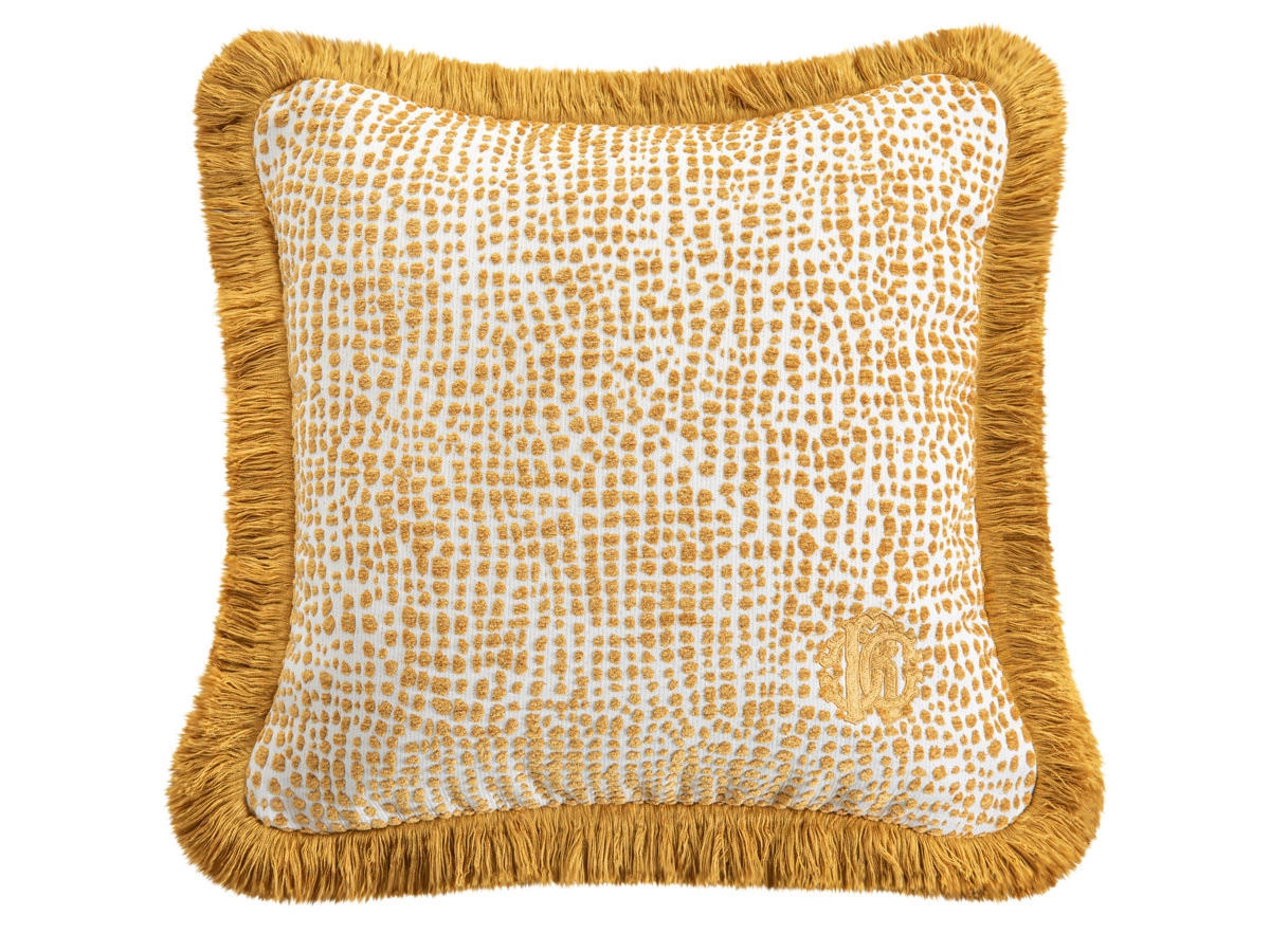 Piękna poduszka dekoracyjna Skin Velvet Gold marki Roberto Cavalli. Białe tło z nakrapianymi, złotymi punkcikami. W rogu, elegancki, haftowany monogram marki. Wyszukana ozdoba salonu lub sypialni. Delikatne frędzle dookoła. Wkład syntetyczny. Każdy produkt z hologramem świadczącym o autentyczności produktu.