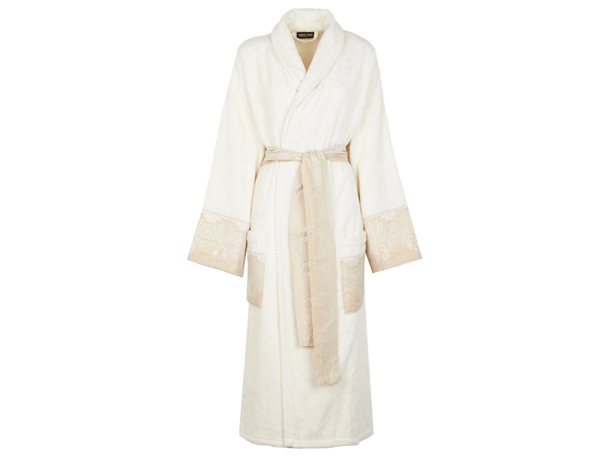 Kremowy szlafrok z kolekcji Royal włoskiego domu mody Roberto Cavalli. Model unisex. Klasyczny krój z szalem. Wykonany z miękkiej tkaniny frotte z ozdobnymi, satynowymi wstawkami. Dwie pojemne kieszenie. Szlafrok zapakowany w eleganckie pudełko z bibułką. Do każdego produktu dołączony został hologram świadczący o autentyczności produktu.