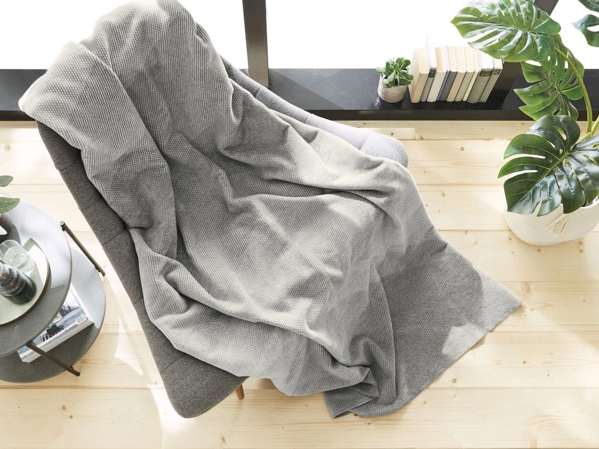 • Duży, dwustronny żakardowy koc Ergesund w modnych odcieniach szarości, wykończony atrakcyjnym ściegiem dzierganym. Doskonale sprawdzi się jako koc dla dwojga lub narzuta na łóżko. Wykonany z bawełny i akrylu.