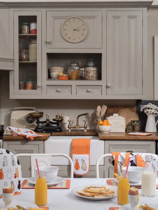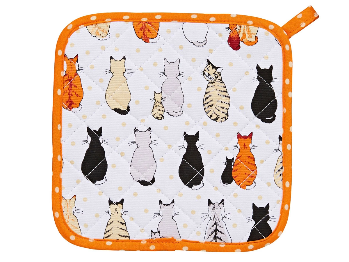 - Łapka kuchenna z kolekcji Cats In Waiting . Ten projekt ilustruje szeroki wybór siedzących tyłem kotów z pomarańczowym wykończeniem w kropki. Idealna do ochrony blatu przed gorącymi garnkami. Wykonana w 100% z bawełny z wypełnieniem poliestrowym.