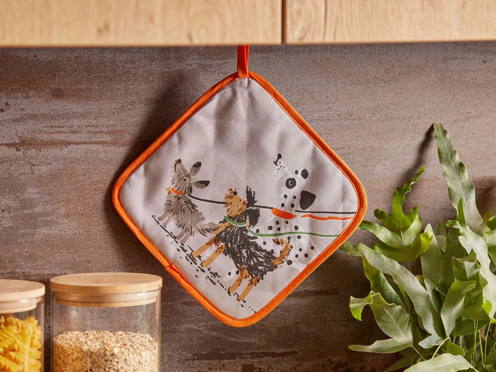 - Łapka kuchenna marki Ulster Weavers z kolekcji Dog Days przedstawiająca z psy na smyczy. Idealna do ochrony blatu przed gorącymi garnkami. Wykonana w 100% z bawełny z wypełnieniem poliestrowym.