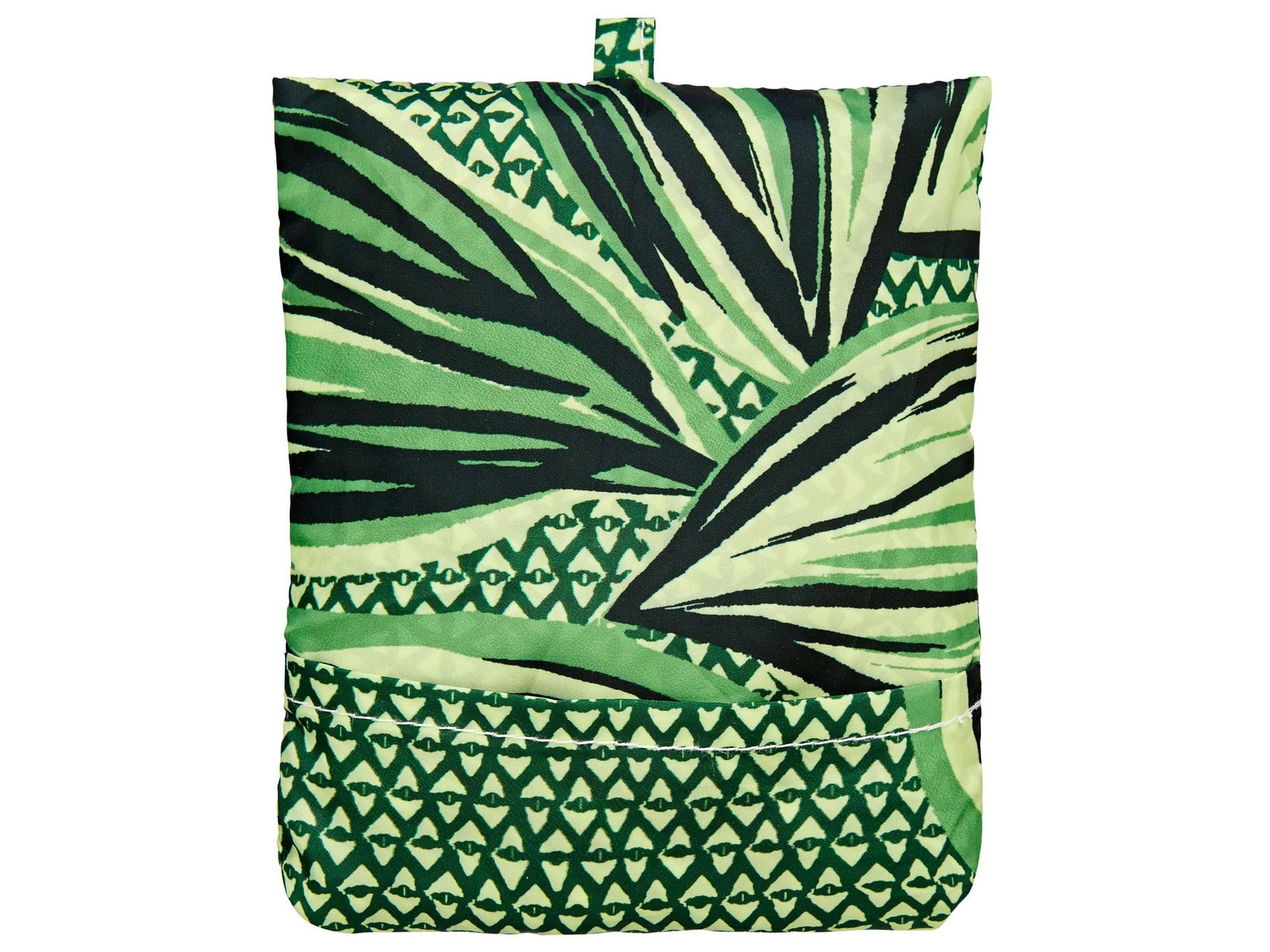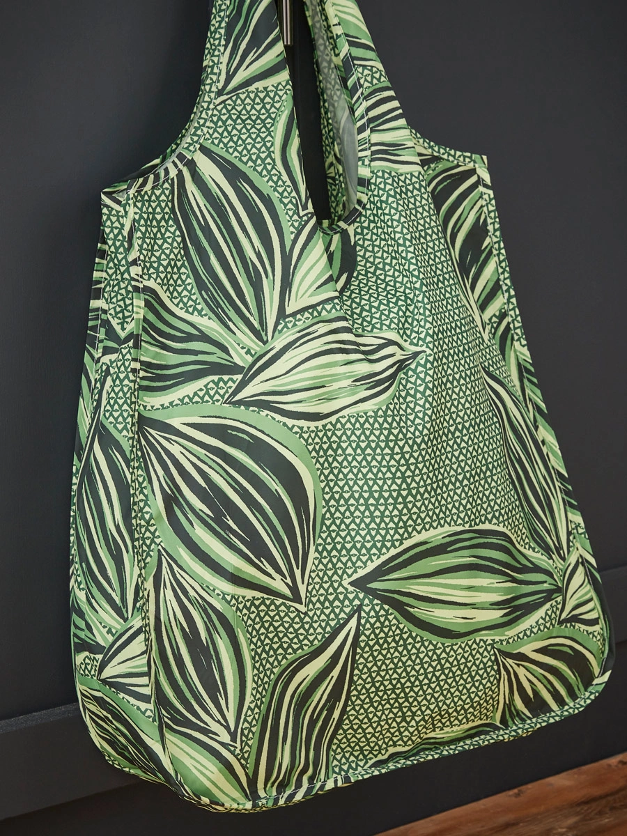 - Siatka na zakupy Geo Leaves w zielone liście. Dzięki łatwemu zwinięciu i zapięciu na guziki, może być przechowywana w torebce lub kieszeni.